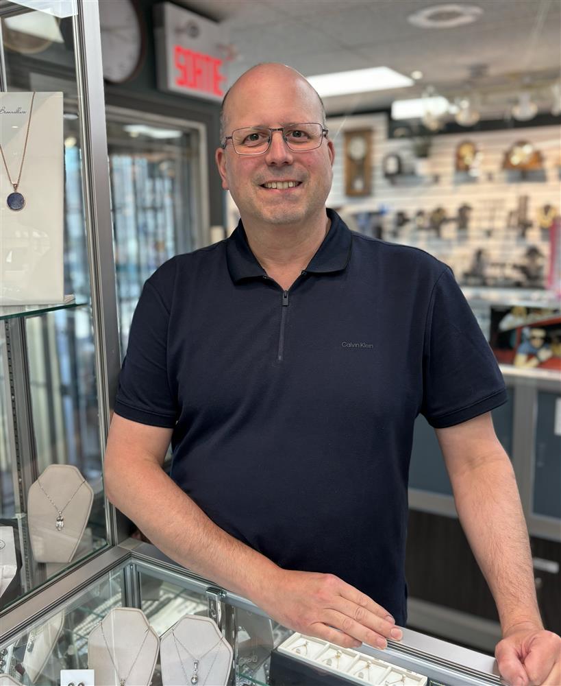 Horloger depuis 27 ans à la bijouterie, Francis s'occupe des réparations d'horloge et des changements de pile dans les montres. Il fait partie de la deuxième génération de la famille Petit. Il prend le temps de répondre à toutes vos questions et il est à l'écoute de vos besoins. Il s'occupe aussi d'évaluer l'or que vous voulez vendre.