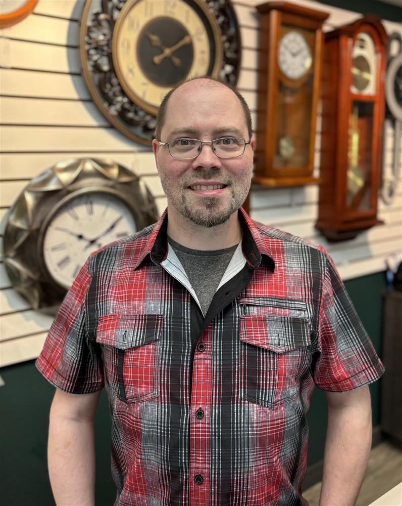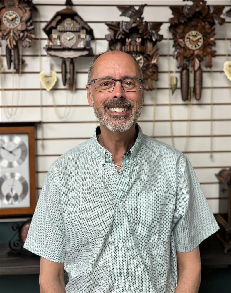 Horloger depuis 36 ans à la bijouterie, Stéphane est la personne attitrée aux réparations d'horloges et de montres. Il fait partie de la deuxième génération de la famille Petit. Très minutieux, il manipule toutes les pièces avec beaucoup de finesse. Stéphane s'occupe aussi des services pour les horloges grand-père et se déplace à votre domicile.