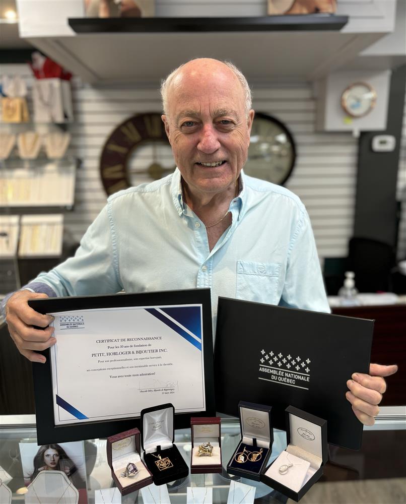 M. Petit est le fondateur de la bijouterie qui fête son 51ième anniversaire cette année. Il œuvre dans le métier depuis plus de 60 ans. Horloger de formation avec une année de spécialisation en Suisse, il se consacre à la bijouterie par la suite. Nous le surnommons le « créateur » dû à sa créativité et ses confections originales.